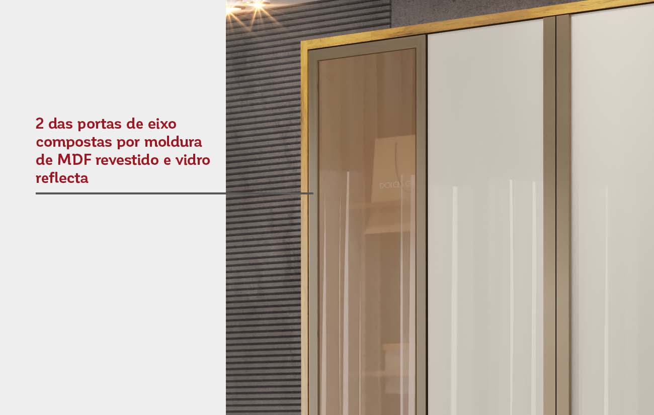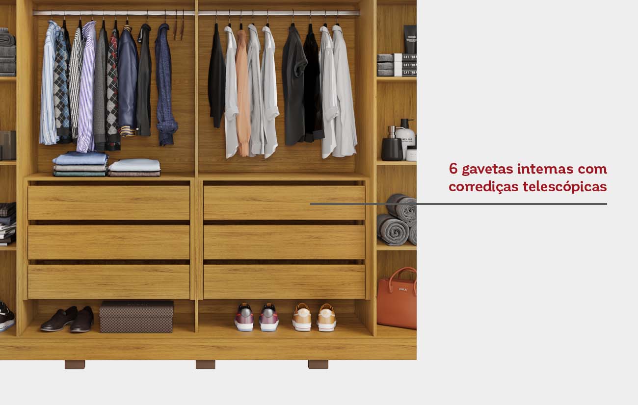 Esteticamente o Guarda-Roupa Ibiza se diferencia pelo uso de molduras decorativas nas laterais, chapéu e rodapé de MDF revestido, trazendo um design atual e elegante. Além disso este produto conta com 6 gavetas internas com corrediças telescópicas. Ainda conta com prateleiras internas para organizar seus objetos, fora o espaçoso maleiro superior ideal para guardar roupa de cama, sendo que todas essas divisões internas configuram espaço ele/ela. Para roupas mais delicadas possui 2 cabideiros em alumínio, tudo isto para manter suas roupas passadas e organizadas.