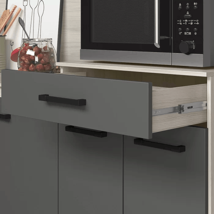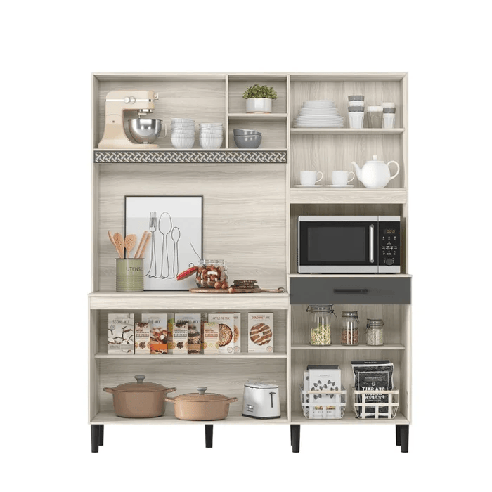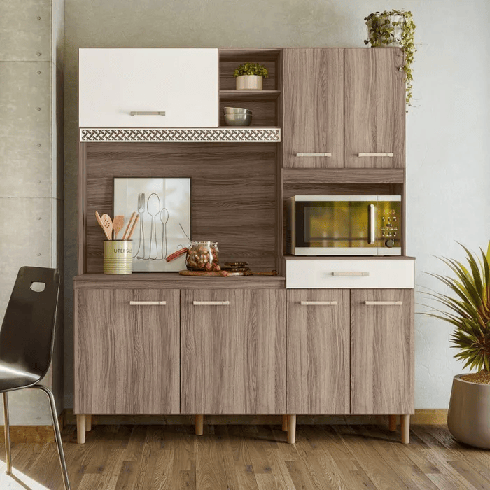 O Kit Cozinha Compacta Yara 160 é moderno e possui ótimo espaço para você que está em busca de uma cozinha de tamanho médio e com bom espaço para armazenamento de seus utensílios, moderna e cheias de estilo. É composto por 07 portas (sendo 6 portas de bater e 1 basculante) com dobradiças de aço e 1 gaveta com corrediças metálicas. Produto é reforçado em MDP com sua estrutura sendo em MDP de 12 milímetros, portas e tampos em MDP de 15 milímetros. Essa cozinha ainda conta com 4 prateleiras e espaço para microondas. Peso suportado nas prateleiras é de 8 kilos