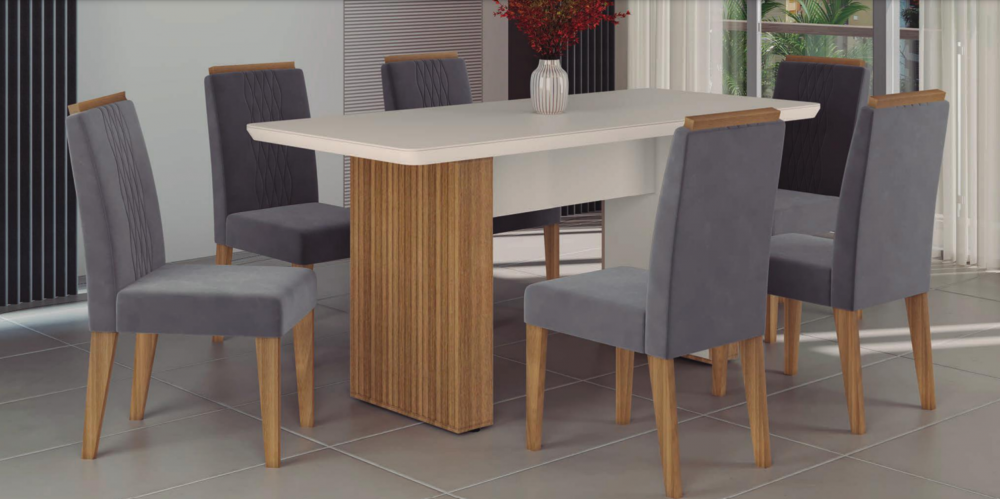 Transforme sua sala de jantar em um ambiente especial com o conjunto Mesa Jaguar e Cadeiras Lia, oferecendo um espaço elegante e acolhedor para compartilhar momentos inesquecíveis.